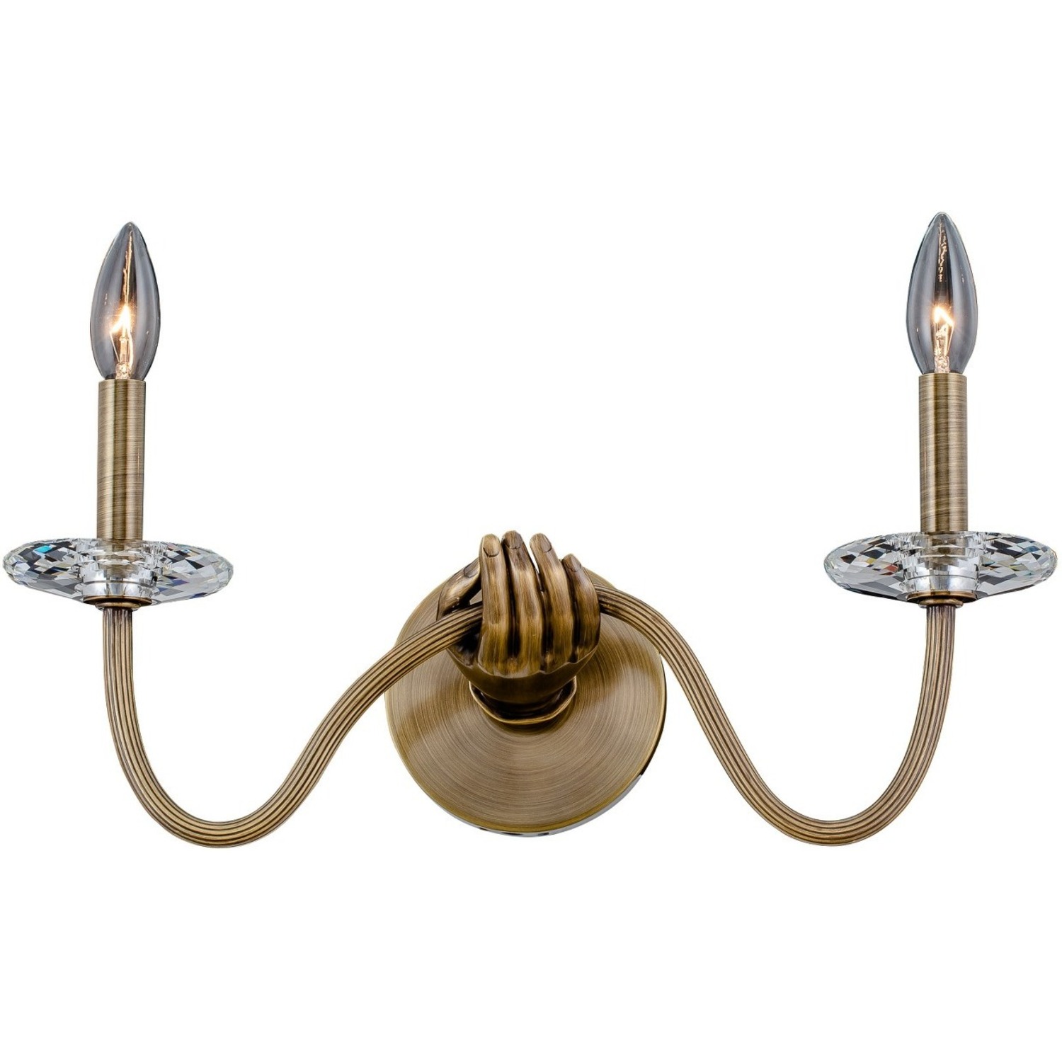Inspired by the physical form and a sense of surrealism. Venus from the ILUMINE collection by Vanessa Deleon elicits curiosity for lighting as art. Cast brass crafted, featuring clear Firenze crystal florets and bobeches.2 Light Wall SconceE12 Candelabra
