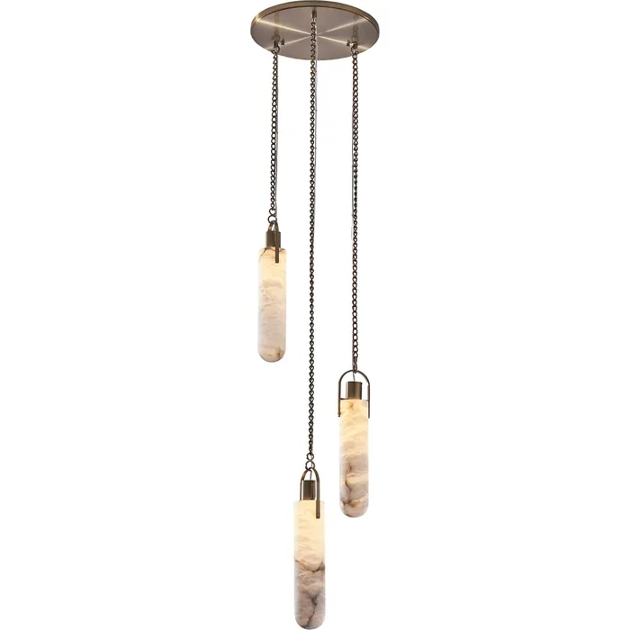 Add dramatic style and design to any space with the Flint Collection of Natural Alabaster and LED drop pendants. Suspended by beautiful jewelry chain, it features A mix of old and new style in a warm Winter Brass finis. This beauty can be used in both a modern or traditional setting. 3 Light PendantIntegrated LED