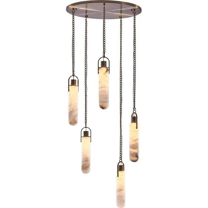 Add dramatic style and design to any space with the Flint Collection of Natural Alabaster and LED drop pendants. Suspended by beautiful jewelry chain, it features A mix of old and new style in a warm Winter Brass finis. This beauty can be used in both a modern or traditional setting. 5 Light PendantIntegrated LED