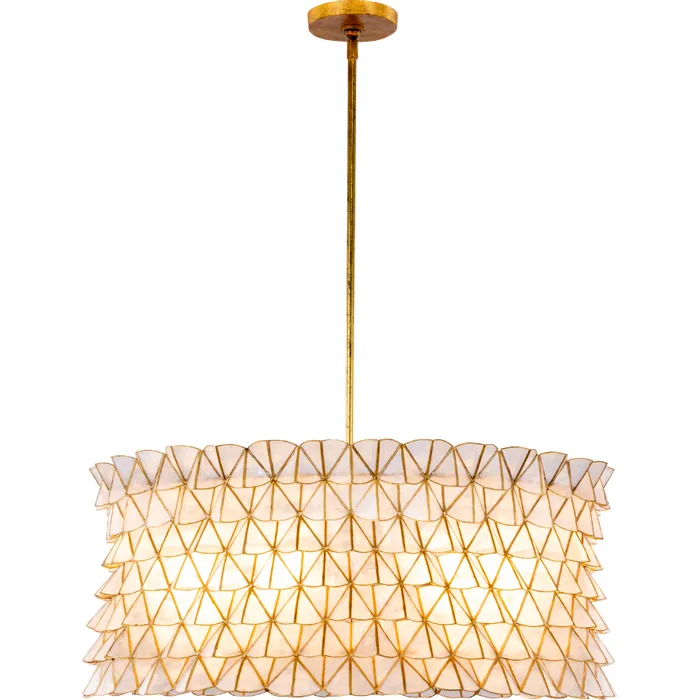 Inspired by the softness of scalloped edges and geometric patterns. The Flair collection is made from natural Capiz shell material and a gold leaf finish. The concave handcrafted pattern allows for a 3D light effect.6 LT PendantE12 Candelabra