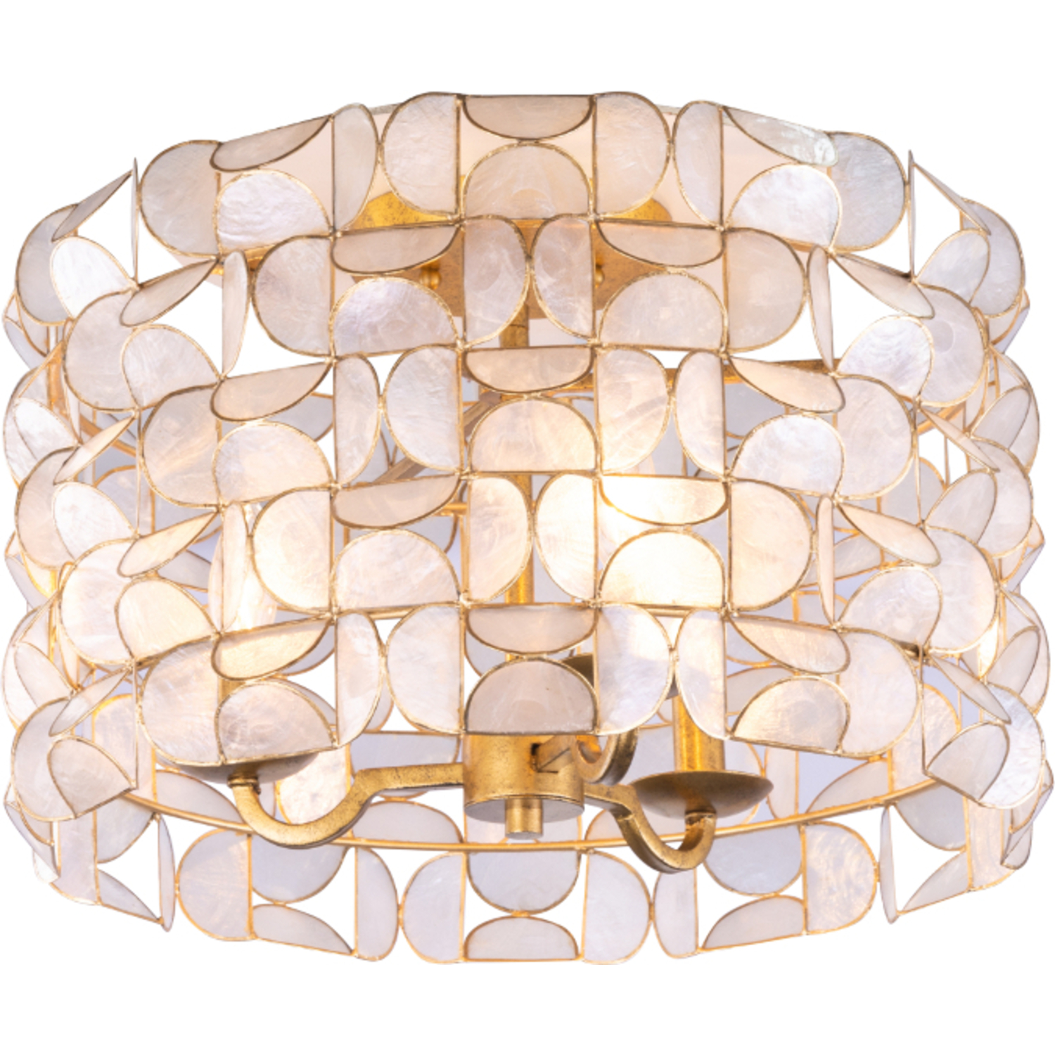 The Crescent collection is inspired by a butterfly swarm over water. This collection features beautiful natural Capiz shell cut in half moon shapes and connects on angles in a clean modern pattern. The simple repeated geometric pattern offers a spectagular visual effect that is quite complex and natural.4 LT Flush MountE12 Candelabra