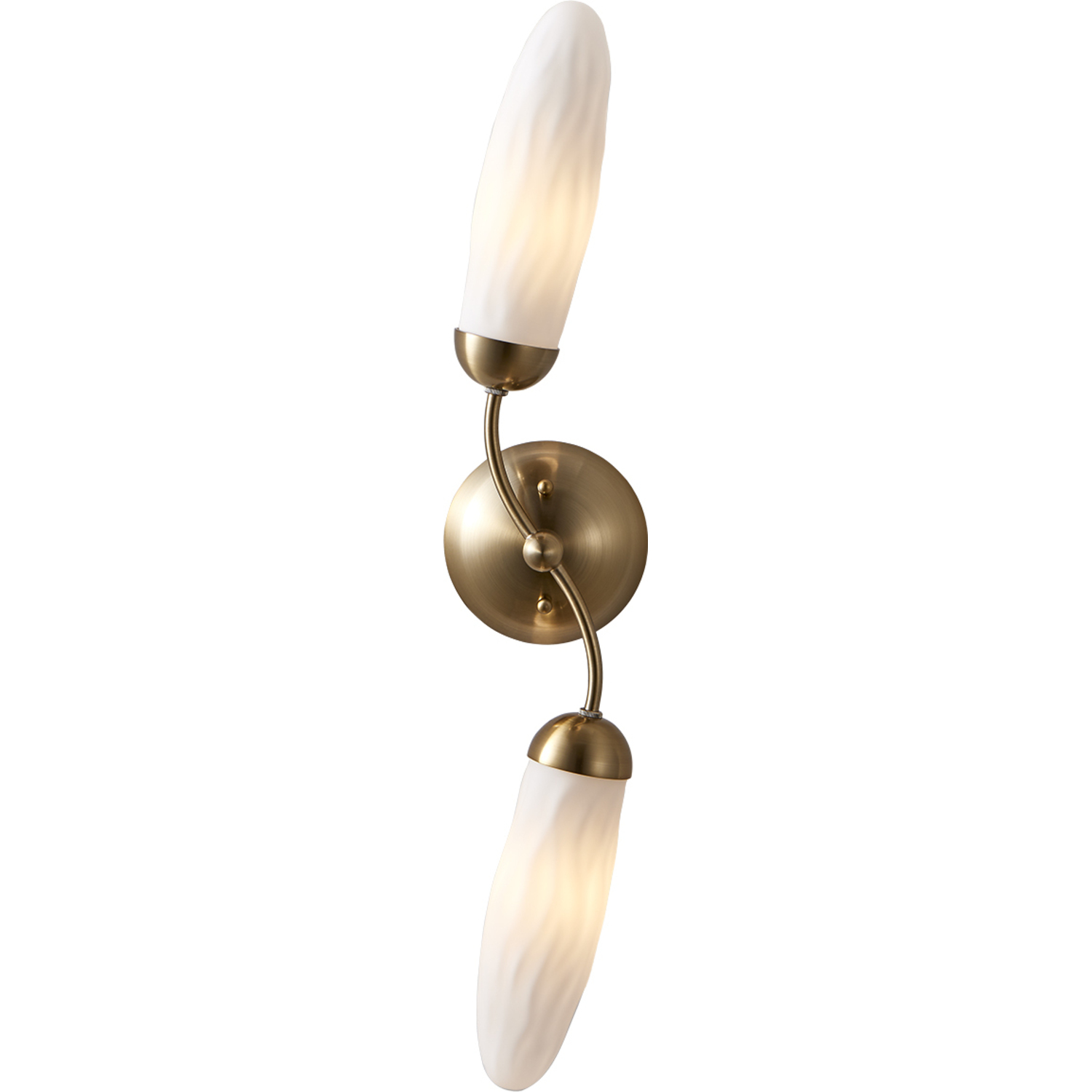 The Crest Collection boasts a botanical inspiration with a water textured effect on the elongated frosted glass shades. The slightly curving arms add softness with a warm glow illuminating from the shades that unscrew from holders for bulb access. Available in a Winter Brass finish.2 Light Wall SconceE12 Candelabra