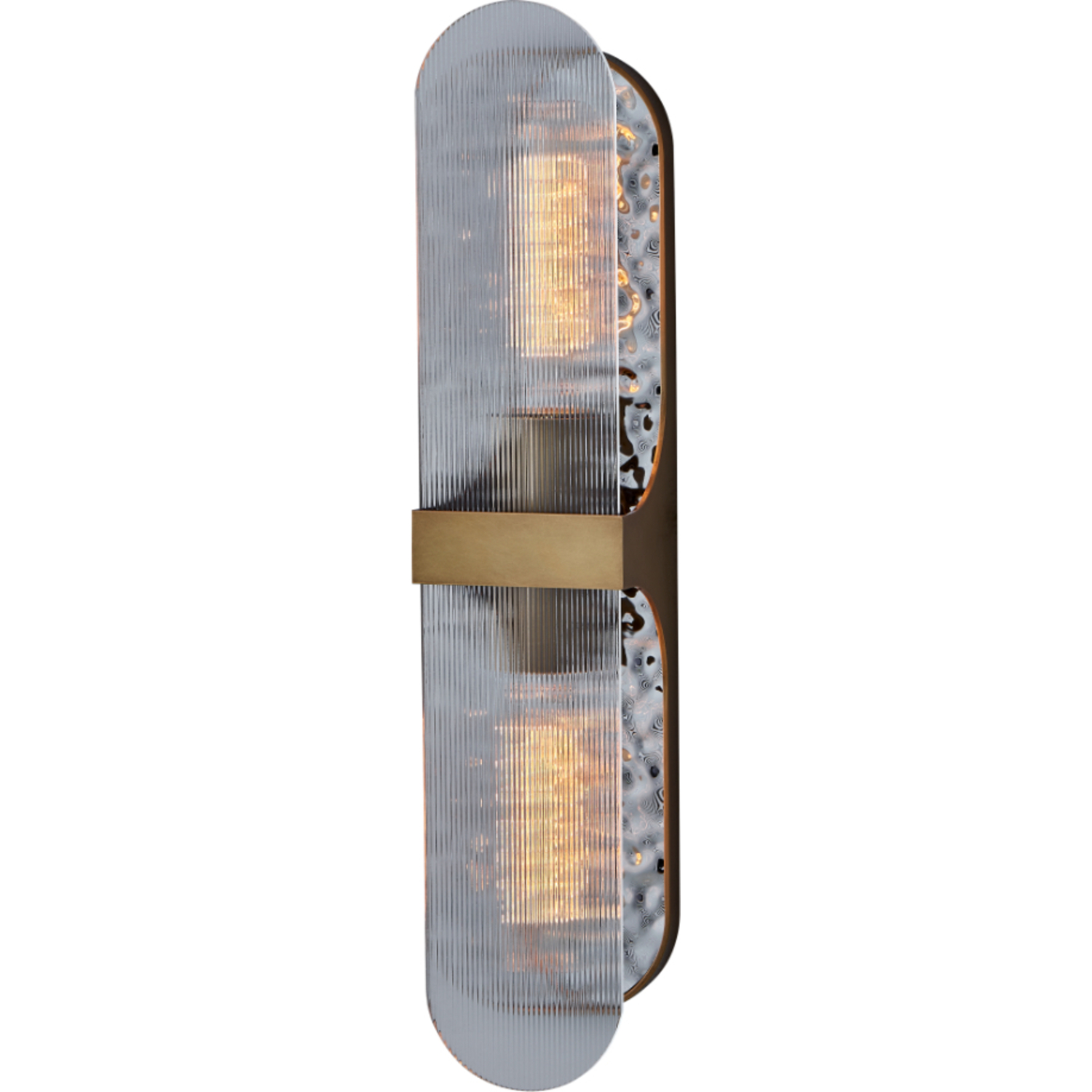 Inspired by the beauty of the sun reflecting on the ocean, Mirage adds serene elegance to any space. A textured mirror-like reflector behind clear reeded glass creates a gentle glow that provides a dazzling light pattern brought together with our True Brass finish.Bath LightE26 Medium