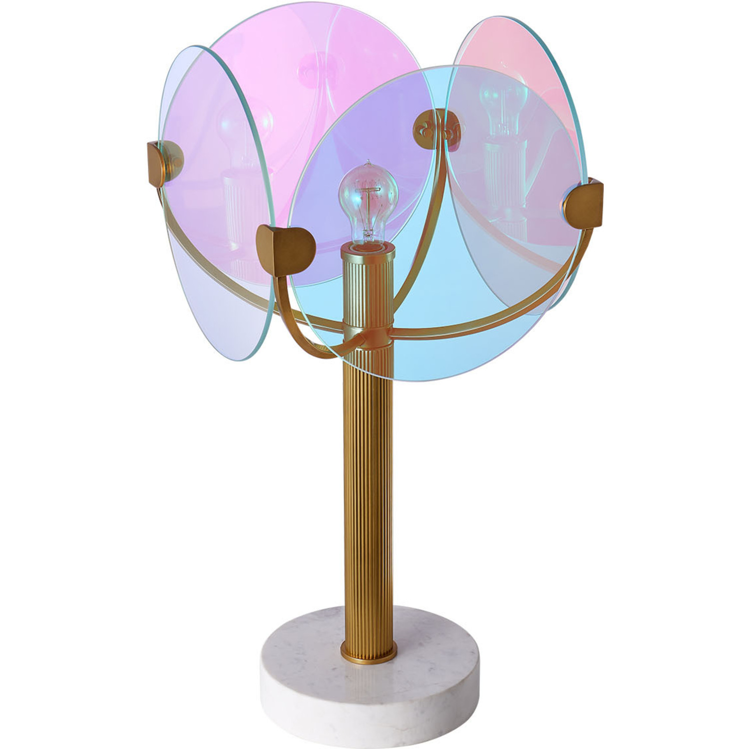 Inspired by geometric design and the captivating iridescence of bubbles. Chroma is crafted from low iron, tempered dichroic glass complemented by the softness of brass details and a white marble base. This lamp offers aesthetics and funcionality, allowing you to set the perfect mood in your space.Table LampMedium Base