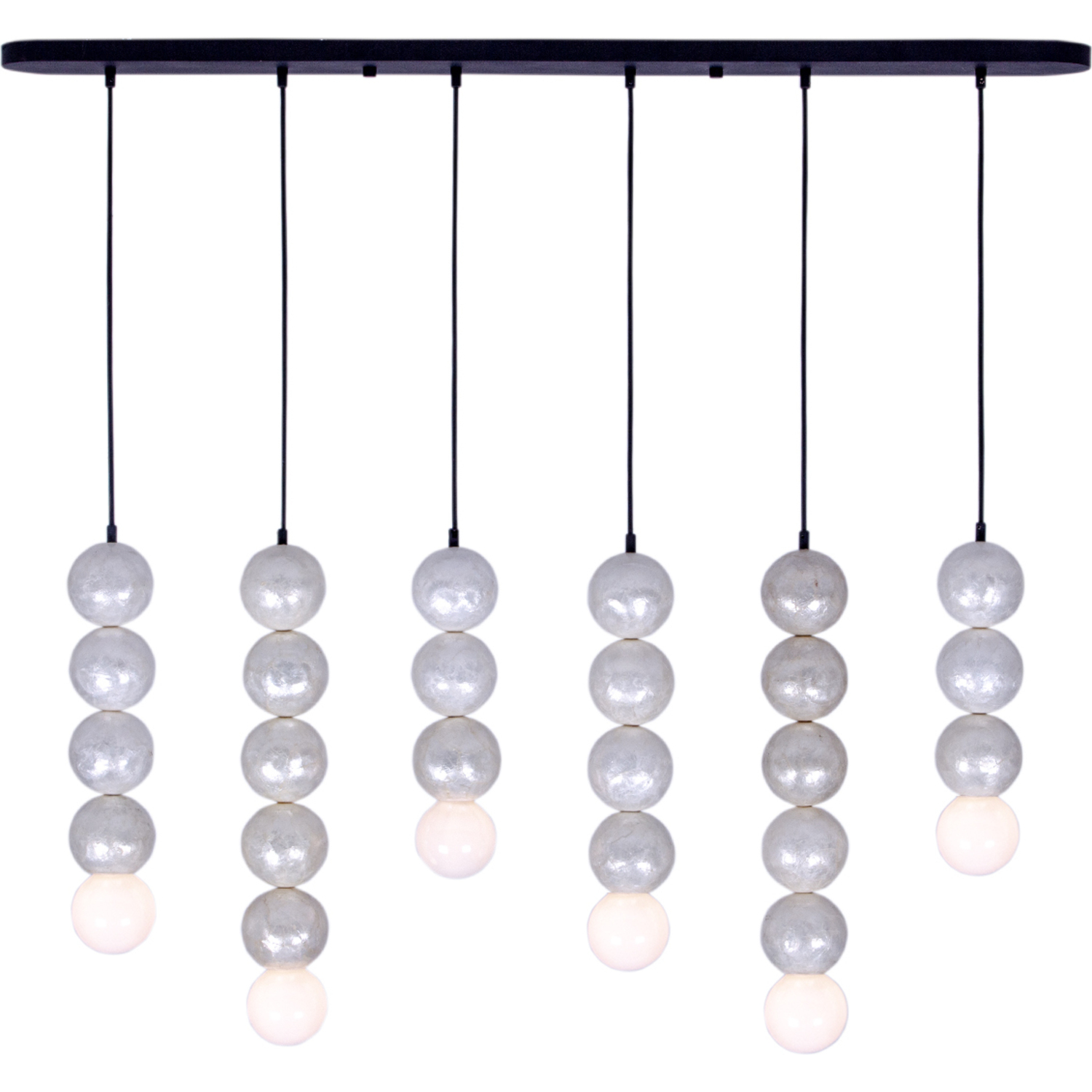 Crafted from natural capiz shells and complemented by a steel canopy and nylon braided cord, Pearls exudes a casula yet luxurious charm with a soft, inviting glow when illuminated. The natural iridescence of the shells adds timeless beauty while the contrast of the Matte Black finish makes it a perfect addition to any space.6 Light IslandMedium Base