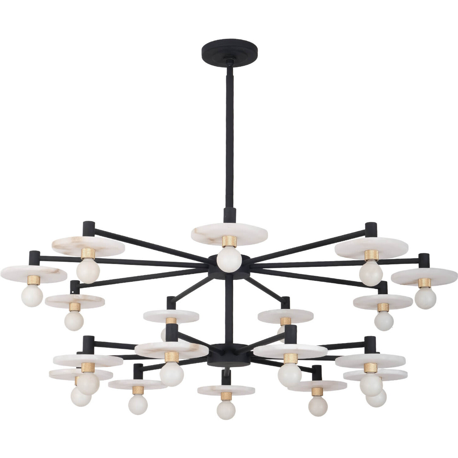 Upgrade your space with the Discus Collection. Inspired by the interplay of Alabaster discs and knurled gold hardware, the alabaster discs create a very modern yet natural ambiance, with bulbs appearing to float and circle above, all while offering the flexibility of use on lower ceilings.2 Tier PendantCandelabra