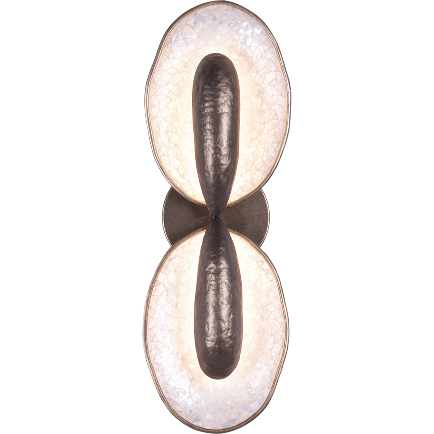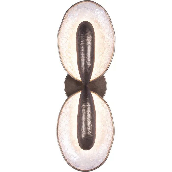 Inspired by oyster shells, the Spat wall sconce family features an uneven natural edge with an iridescent natural Capiz Shell interior. The driverless LED technology offers an indirect light that bounces off the shells to illuminate its surroundings. Offered in a Pearlized Antique Brass finish and can be hung both upside down and sideways.2 Light LED Wall SconceIntegrated LED