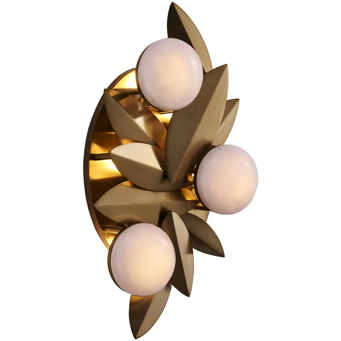 With its design evoking the elegance of a brooch, the Blush wall sconce is artfully fashioned from iron and natural pink jade. This contemporary and lively light fixture draws inspiration from berries hidden among leaves. Boasting a rich Winter Brass finish, it would bring a touch of sophistication to any room. ___________________ [WORDPRESS_PDF]WALL SCONCEG9 LED
