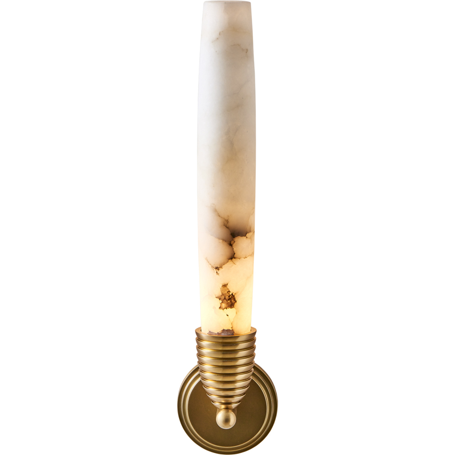 Botanically inspired by Pinecone shapes, the soft Art Deco design of the Gypsum wall sconce features a cylindrical slightly bulged natural Alabaster stone cylinder that diffuses the LED light and gives the fixture a softer luxurious look. Offered in True Brass with driverless LED technology. LED Wall SconceIntegrated LED