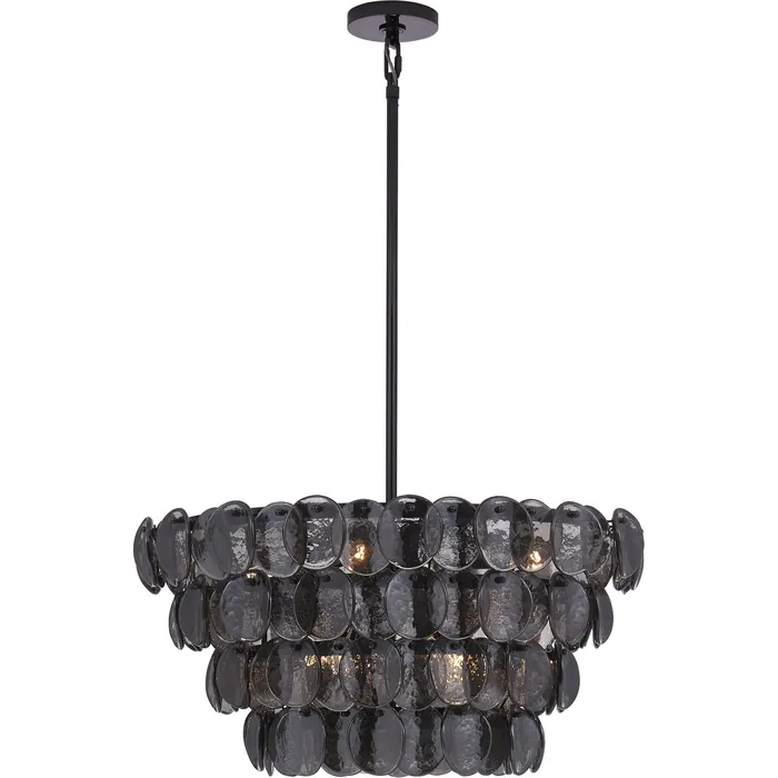Illuminate your space with our fish scale inspired Uroko collection. Glass discs are expertly crafted to provide a subtle yet striking lighting effect, creating a warm and inviting ambiance wherever it is placed. The Glossy Warm Black Nickel finish and shimmering glass make this fixture a focal point in any room. _________________ [WORDPRESS_PDF]28 IN PENDANT BNE12 Candelabra
