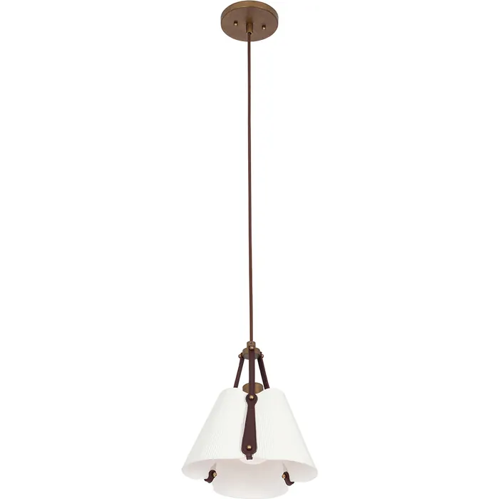 Celebrate the timeless elegance of this contemporary fixture, perfect for compact spaces. The Embrace Collection draws inspiration from delicate fabric, and the bone china shade is accented with rich mahogany leather straps and a sleek, dark brown cord, allowing light to filter through and highlight its textured surface. The canopy and hardware boast a Pearlized Antique Brass finish, adding a touch of sophistication. _________________ [WORDPRESS_PDF]1 LT PENDANTE26 Medium Base