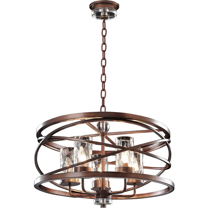 The design of our Eternity Collection was inspired by the Celtic symbol of eternity, the Annulus. The interlocking rings, featured in Kalco’s exclusive Etruscan Bronze finish, are positioned to create a sense of movement and are highlighted by solid crystal accents and Clear Water Glass. This circular design represents the continuous cycle of time while the metal represents the Celtic connection to Earth, land and nature.5 Light PendantE12 Candelabra