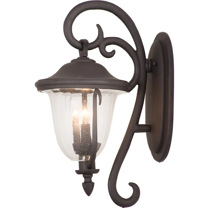 The Santa Barbara Collection was inspired by Colonial Mexico’s Mission Churches and Cathedrals. The long history of hand-crafted wrought iron, shared by both Mexico and Kalco, come together to create a series of outdoor lighting pieces that feature Kalco’s exclusive Burnished Bronze, Textured Matte Black finishes and Clear Seeded Hammered Glass shades.Outdoor 2 Light Small Wall BracketE12 Candelabra