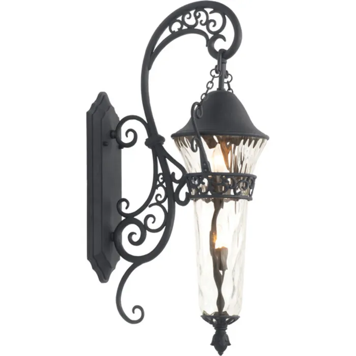 The Anastasia Outdoor collection combines eye-catching Art Nouveau scrollwork with traditional lantern design. The delicate curves of this design are highlighted by Kalco’s exclusive Outdoor finishes and our Clear Hammered Glass creates a flickering effect to the eletric lights. This combination is sure to add a touch of whimsical elegance to any outdoor space.Outdoor 2 Light Large Wall BracketE12 Candelabra