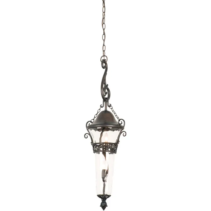 The Anastasia Outdoor collection combines eye-catching Art Nouveau scrollwork with traditional lantern design. The delicate curves of this design are highlighted by Kalco’s exclusive Outdoor finishes and our Clear Hammered Glass creates a flickering effect to the eletric lights. This combination is sure to add a touch of whimsical elegance to any outdoor space.Outdoor 2 Light Medium Hanging LanternE12 Candelabra