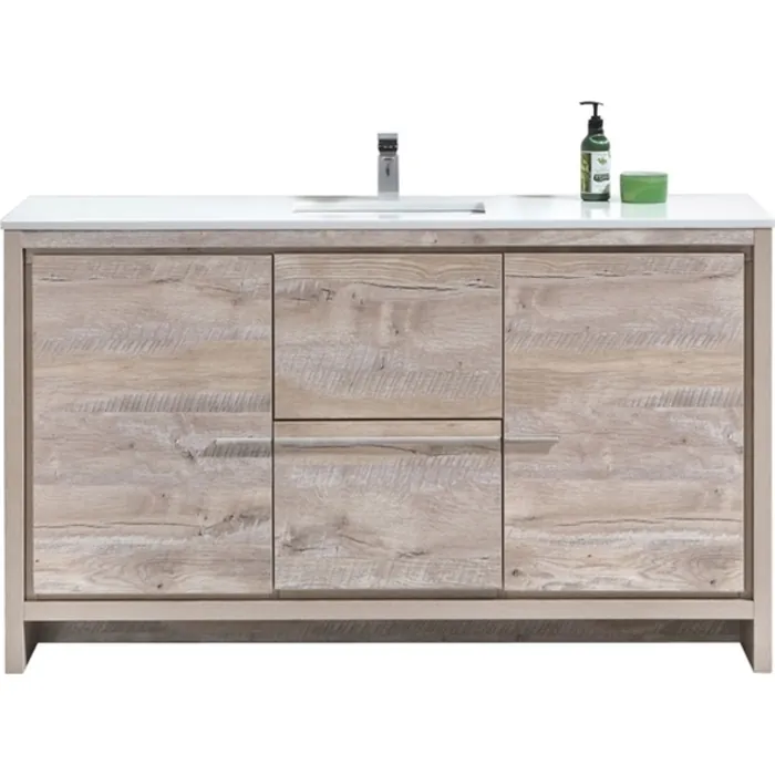 The Dolce Vanity by KubeBath is one of the most elegant modern Bathroom Vanities around. This 60" Single Sink model comes with a durable pure white Quartz Countertop and features two Doors and three Drawers with high quality European Hardware, that provides smooth soft-closing operation. Top and bottom Drawers features push-open operation. KubeBath Vanities come fully assembled and ready for Installation. Countertop and Sink come on separate Boxes for secure shipping and need minimal Installation.