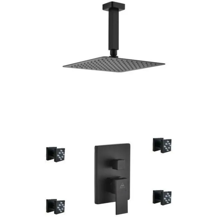Kubebath Aqua Piazza Matte Black Shower Set With 8 inch Ceiling Mount Square Rain Shower And 4 Body Jets BK-CR2004J2V