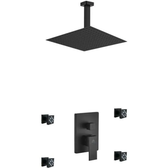 Kubebath Aqua Piazza Matte Black Shower Set With 12 inch Ceiling Mount Square Rain Shower And 4 Body Jets BK-CR3004J2V