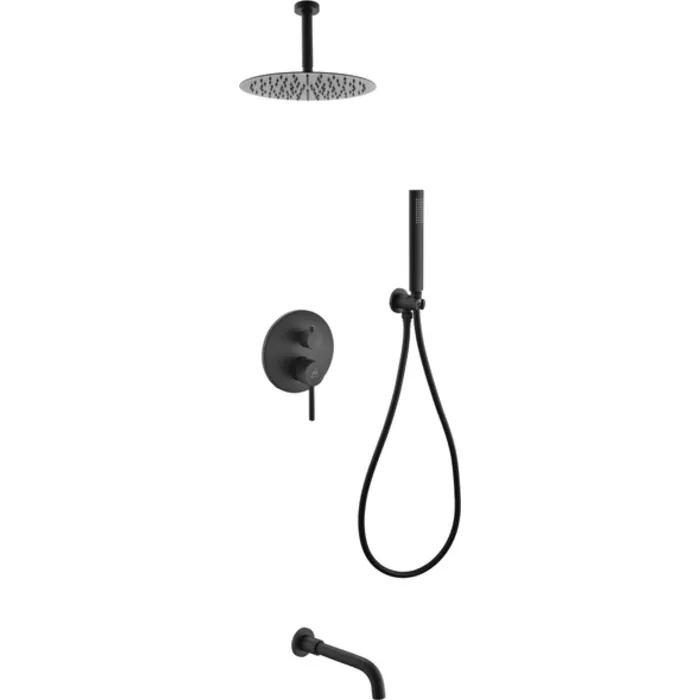 Kubebath Aqua Rondo Matte Black Shower Set w/ Ceiling Mount 12 inch Rain Shower, Handheld and Tub Filler BK-RCR12HHTF3V