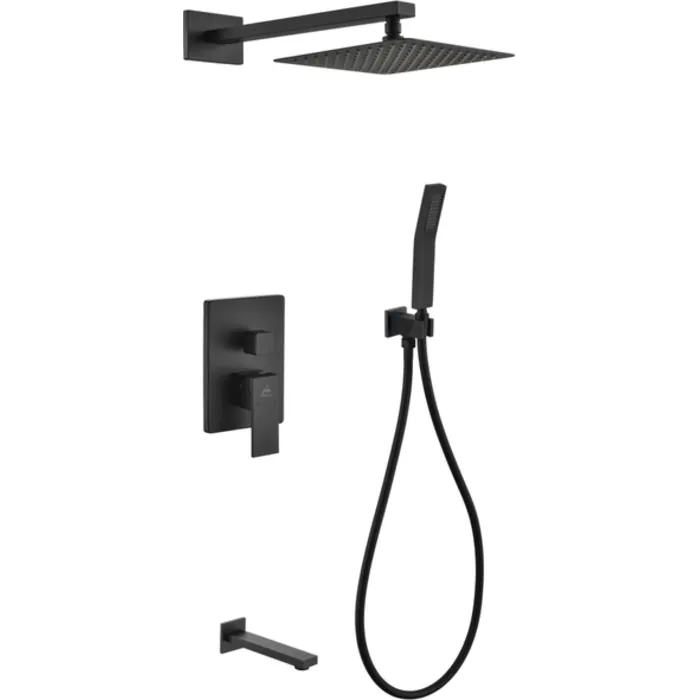Kubebath Aqua Piazza Matte Black Shower Set With 8 inch Square Rain Shower, Tub Filler And Handheld BK-WR200TFHH3V