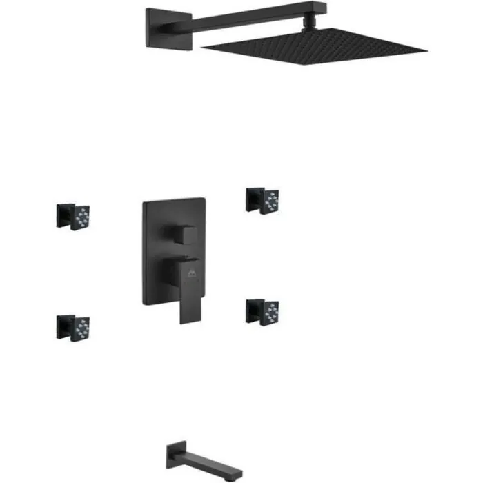 Kubebath Aqua Piazza Matte Black Shower Set With 12 inch Square Rain Shower, Tub Filler And 4 Body Jets BK-WR3004JTF3V