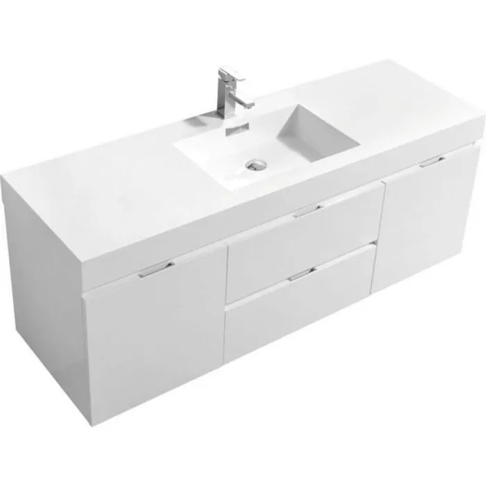 Kubebath Bliss 60 inch Single Sink High Gloss White Wall Mount Modern Bathroom Vanity BSL60S-GW