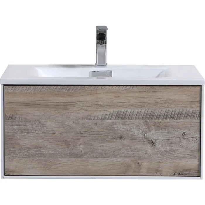 The Divario floating wall-mounted bathroom vanity features one spacious drawer for storing bathroom essentials. The clean, contemporary lines are enhanced by a crisp white integrated sink, High Gloss White finished sides and Nature Wood drawer front finish.