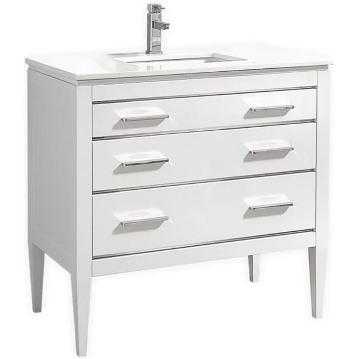 Inspired by both the art deco movement of the '20s, '30s, and '40s and the elegant simplicity of European design, the Eiffel Bathroom Vanity was created from responsibly sourced Solid Wood. Each piece is assembled using intricate shapes that slot together forming a sturdy yet graceful structure. The Eiffel 36" Vanity features two fully functional drawers, a pure white Quartz countertop with a white Ceramic undermount Sink. The cabinet is finished in a white lacquer paint finish, while the inside of the drawers are varnished, with the natural wood color exposed.