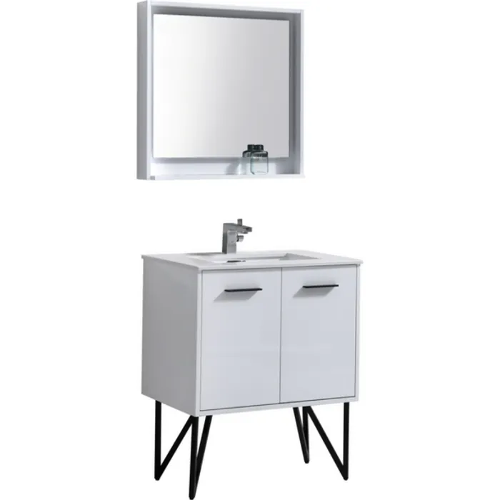 Breathe new life into your bathroom decor with the new Bosco modern Bathroom Vanity. The Bosco Vanity Set includes a white Quartz Countertop, undermount reinforced acrylic sink with and a matching Mirror that perfectly complements the vanity cabinet. This Vanity features two doors and a nested drawer.