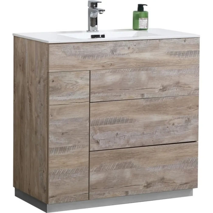 Minimalists are drawn to Milano, a no-fuss Vanity with panache that goes beyond its simple presence. Though its silhouette is spare, the Nature Wood finish and aluminum kickboard provide just enough wow factor. The integrated Push-Open sliders ensure all drawers and door glide open and shut with little effort every time. The Milano Vanity features one door and three fully functional drawers and a crisp white acrylic composite countertop with integrated sink.