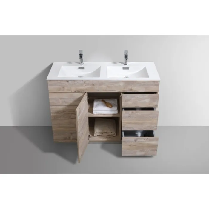 Minimalists are drawn to Milano, a no-fuss Vanity with panache that goes beyond its simple presence. Though its silhouette is spare, the Nature Wood finish and aluminum kickboard provide just enough wow factor. The integrated Push-Open sliders ensure all drawers and door glide open and shut with little effort every time. The Milano Vanity features one door and six fully functional drawers and a crisp white acrylic composite countertop with integrated sinks.