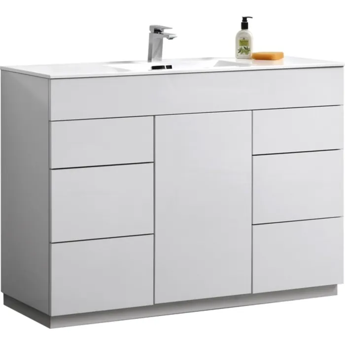 Minimalists are drawn to Milano, a no-fuss Vanity with panache that goes beyond its simple presence. Though its silhouette is spare, the high-gloss finish and aluminum kickboard provide just enough wow factor. The integrated Push-Open sliders ensure all drawers and door glide open and shut with little effort every time. The Milano Vanity features one door and six fully functional drawers and a crisp white acrylic composite countertop with integrated sink.
