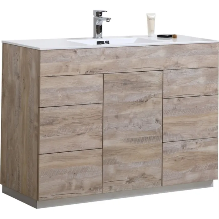 Minimalists are drawn to Milano, a no-fuss Vanity with panache that goes beyond its simple presence. Though its silhouette is spare, the Nature Wood finish and aluminum kickboard provide just enough wow factor. The integrated Push-Open sliders ensure all drawers and door glide open and shut with little effort every time. The Milano Vanity features one door and six fully functional drawers and a crisp white acrylic composite countertop with integrated sink.