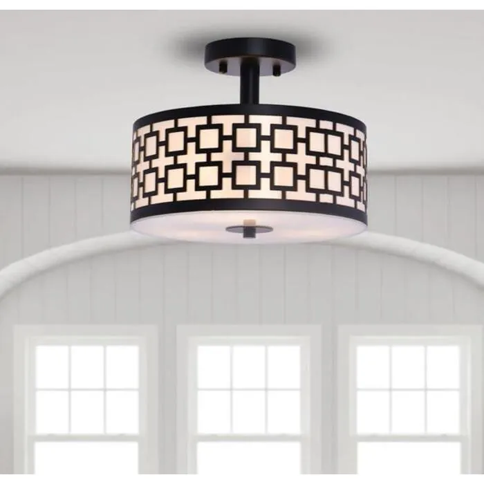 Brighten up your space with this traditional and classic LAZZUR Gironde 3 Light 12 in. Matte Black Semi-Flush Mount Ceiling Light. The drum shape shade with geometrical patterns radiates style and uniqueness. The fixture is suspended by (1) 3.6 in. matte black rod attached to a circular matte black canopy. This light fixture's shade is matte black and can easily match any room style. 3 E26 lightbulbs (not included) are required to use the LAZZUR Gironde Semi-Flush Mount Light.
