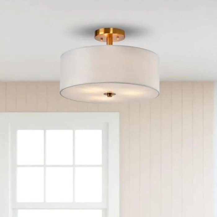 With its simple design, the LAZZUR Herault 3 Light 16 in. Brushed Gold Semi-Flush Mount Ceiling Light will give a feeling of comfort and beauty to your home. The light fixture shade is made of a white, linen-blend, fabric. It has a frosted glass diffuser and is held by (1) 3.95'' brushed gold rod. The two color combination displays a simple, clean, design. Illuminate your space with the LAZZUR Herault Semi-Flush Mount Ceiling Light with 3 E26 lightbulbs (not included).