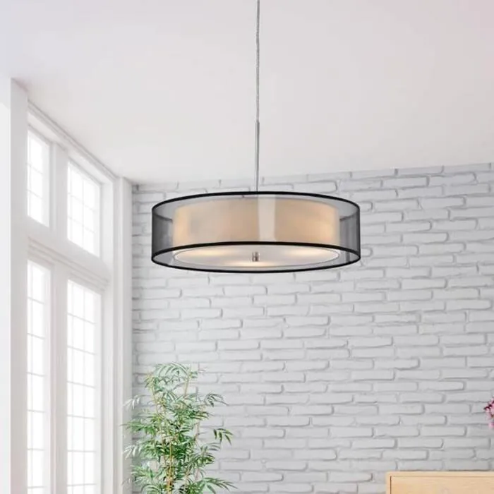 Upgrade your living room with the LAZZUR Ource 3 Light 20 in. Polished Chrome Pendant. The shade is made of linen-blend fabric, where the outer shade is gray, while the inner shade is white. The bottom and top parts of the shade are emphasized with darker lines, especially when the 3 E26 lightbulbs (not included) are lit. The frosted glass diffuser at the base of the pendant helps to provide some complementary contrast. The LAZZUR Ource Polished Chrome Pendant's wire has an adjustable length of 37.1 in. allowing for a minimum height of 13.6 in. and a maximum height of 51.7 in. This type of pendant is perfect to bring a unique look to your home.