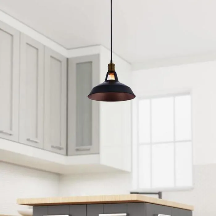 Give your home an industrial look with the LAZZUR Saone 1 Light 12 in. Matte Black Pendant. This industrial inspired pendant light fixture is made of metal and is finished in matte black. The dome shape of the shade adds more of the industrial appeal. The pendant requires a single E26 lightbulb (not included). The LAZZUR Saone Matte Black Pendant has a minimum height of 10.0 in., but has an adjustable wire length of 60.8 in., making its maximum height 70.9 in. If you are looking for an industrial, rugged look, then this pendant is for you!