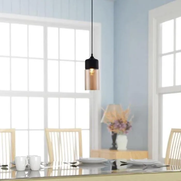 Minimalism is the style of choice with the LAZZUR Besbre 1 Light 5 in. Matte Black Pendant. With its cylindrical shape, amber glass shade, it will be a statement piece in any room in your home. The use of a single E26 lightbulb (not included) is required on this fixture. The wire on the pendant has an adjustable length of 106 in, allowing for the pendant to have a 14.4 in. minimum height and a 120 in. maximum height. A cluster of the LAZZUR Besbre Matte Black Pendant's would be perfect for a kitchen counter setting or over a dining room table.