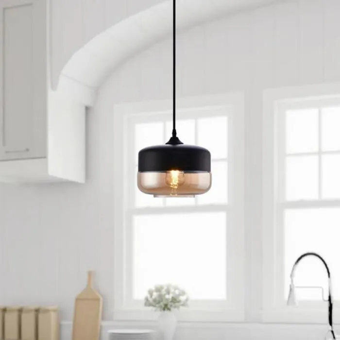 Bring an industrial theme to either your kitchen or dining room with the LAZZUR Acolin 1 Light 10 in. Matte Black Pendant. The cylinder-shaped shade of this light fixture is made of amber glass. It is also suspended with a matte black wire that has an adjustable length of 60 in. The pendant's minimum height is 10 in. and a maximum 70 in., perfect to place over a dining table or a kitchen counter. The LAZZUR Acolin Matte Black Pendant requires a single E26 lightbulb (not included). Rest assured, the unique design, coupled with the amber glass shade will leave a warm ambiance in your space.