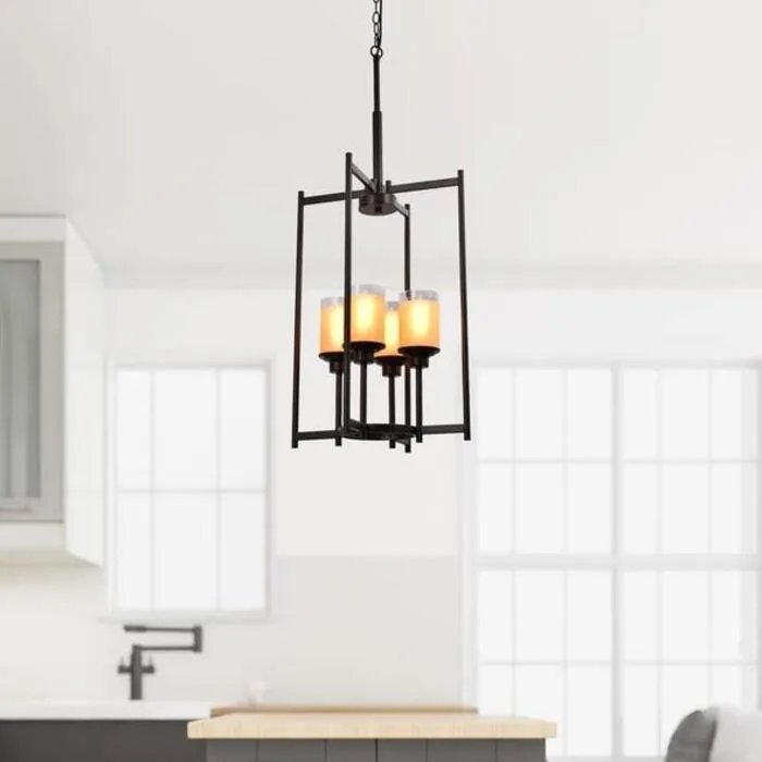 Make a transition from a modern to a traditional style using the LAZZUR Vendee 4 Light 18 in. Matte Oil Rubbed Bronze Chandelier. The matte oil rubbed bronze open framework gives a touch of traditional beauty to this chained chandelier. It has modern and subtle hints thanks to its simple geometrical lines and 4 shaded glass, cylinder shades. The chandelier requires 4 E26 lightbulbs (not included) for usage. The lights that glow within the glass shades are perfect in lighting your spaces at home. The LAZZUR Vendee Matte Oil Rubbed Bronze Chandelier has an adjustable chain with a length of 39.4 in. that give it a minimum height of 42.7 in. or a maximum height of 84 in.