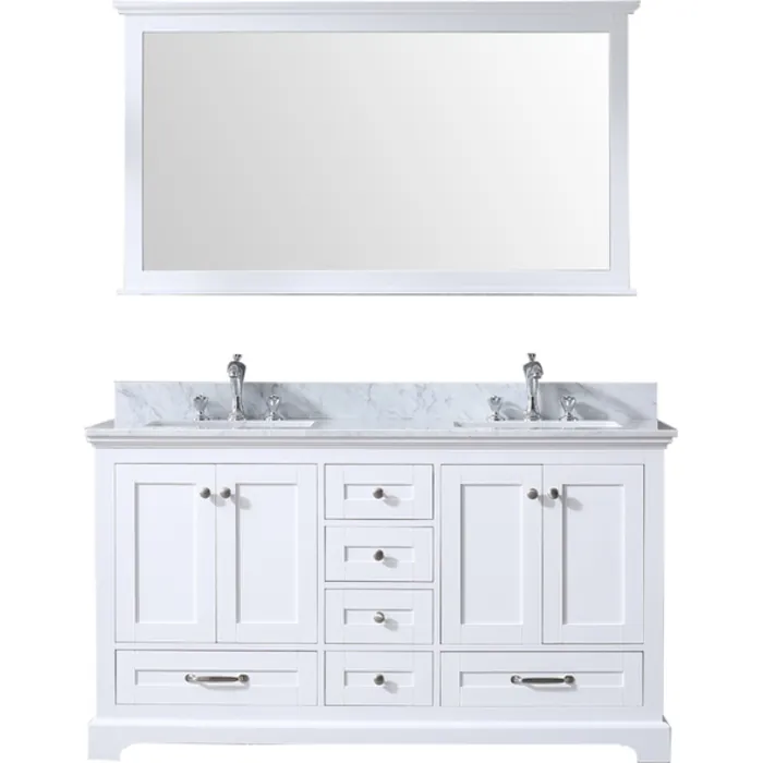 Lexora 60 inch White Double Bathroom Vanity Ensemble with White Carrara Marble Top with White Ceramic Square Undermount Sinks and 58 inch Mirror with Faucets LD342260DADSM58F
