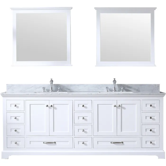 Lexora 84 inch White Double Bathroom Vanity Ensemble with White Carrara Marble Top with White Ceramic Square Undermount Sinks and 34 inch Mirrors with Faucets LD342284DADSM34F