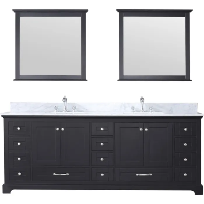 Lexora 84 inch Espresso Double Bathroom Vanity Ensemble with White Carrara Marble Top with White Ceramic Square Undermount Sinks and 34 inch Mirrors with Faucets LD342284DGDSM34F