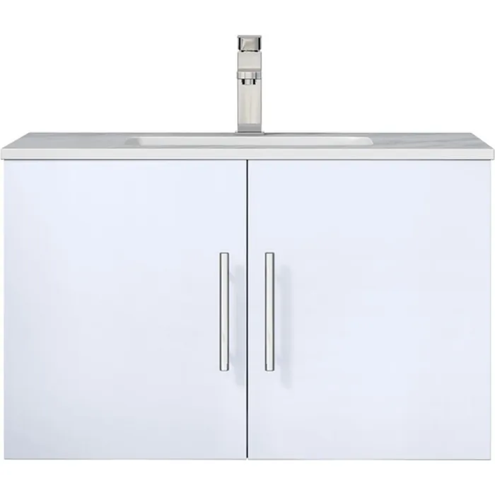 The wall-mounted Geneva vanity in white from Lexora is a beautiful blending of postmodern style and sensible functionality. Its simple, box-like design is complemented by a countertop that lends hints of classical style. When mounted on the wall, the Geneva vanity leaves ample space beneath for additional storage—ideal for bathrooms with limited space. Available in different colors, you can easily match this vanity to any bathroom décor. This piece is all you need to give your bathroom a total makeover.