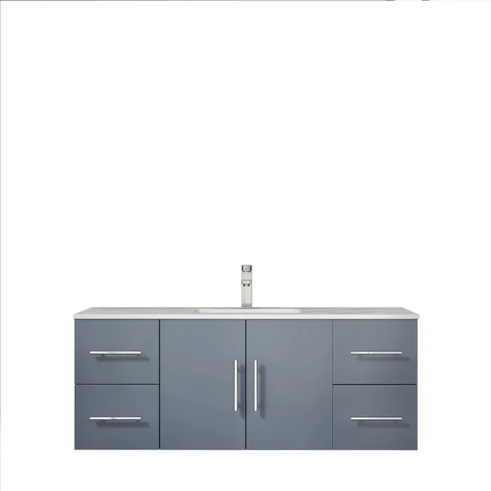 The wall-mounted Geneva vanity in dark grey from Lexora is a beautiful blending of postmodern style and sensible functionality. Its simple, box-like design is complemented by a countertop that lends hints of classical style. When mounted on the wall, the Geneva vanity leaves ample space beneath for additional storage—ideal for bathrooms with limited space. Available in different colors, you can easily match this vanity to any bathroom décor. This piece is all you need to give your bathroom a total makeover.