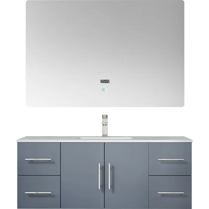 The wall-mounted Geneva vanity in dark grey from Lexora is a beautiful blending of postmodern style and sensible functionality. Its simple, box-like design is complemented by a marble countertop that lends hints of classical style. When mounted on the wall, the Geneva vanity leaves ample space beneath for additional storage—ideal for bathrooms with limited space. Also available in other colors, you can easily match this vanity to any bathroom décor. And, with two undermount sinks and a with premium LED mirror(s), this piece is all you need to give your bathroom a total makeover.