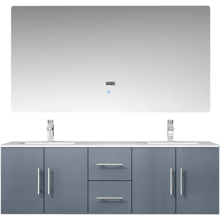 The wall-mounted Geneva vanity ensemble in dark grey from Lexora is a beautiful blending of postmodern style and sensible functionality. Its simple, box-like design is complemented by a marble countertop that lends hints of classical style. When mounted on the wall, the Geneva vanity leaves ample space beneath for additional storage—ideal for bathrooms with limited space. Also available in other colors, you can easily match this vanity to any bathroom décor. And, with a pair of undermount sinks, faucets, drains, p-traps and with premium LED mirror(s), this piece is all you need to give your bathroom a total makeover.