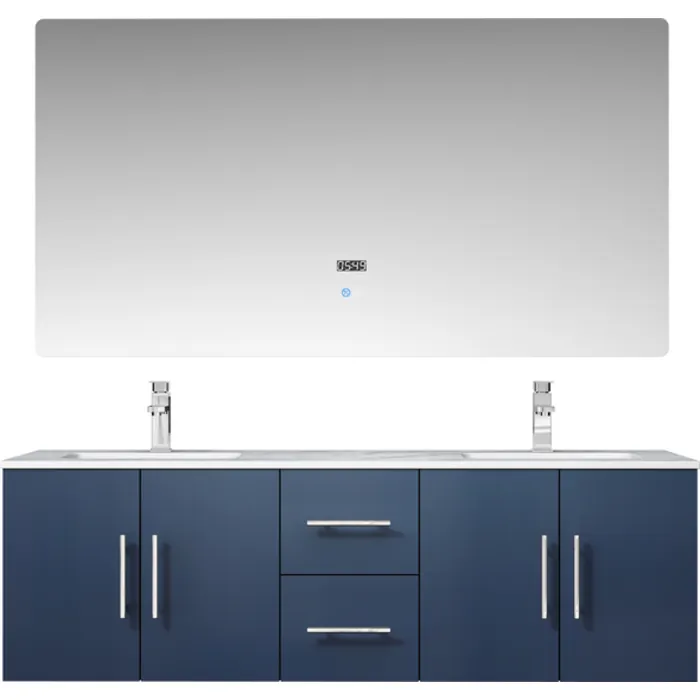 The wall-mounted Geneva vanity ensemble in nvay blue from Lexora is a beautiful blending of postmodern style and sensible functionality. Its simple, box-like design is complemented by a marble countertop that lends hints of classical style. When mounted on the wall, the Geneva vanity leaves ample space beneath for additional storage—ideal for bathrooms with limited space. Also available in other colors, you can easily match this vanity to any bathroom décor. And, with a pair of undermount sinks, faucets, drains, p-traps and with premium LED mirror(s), this piece is all you need to give your bathroom a total makeover.