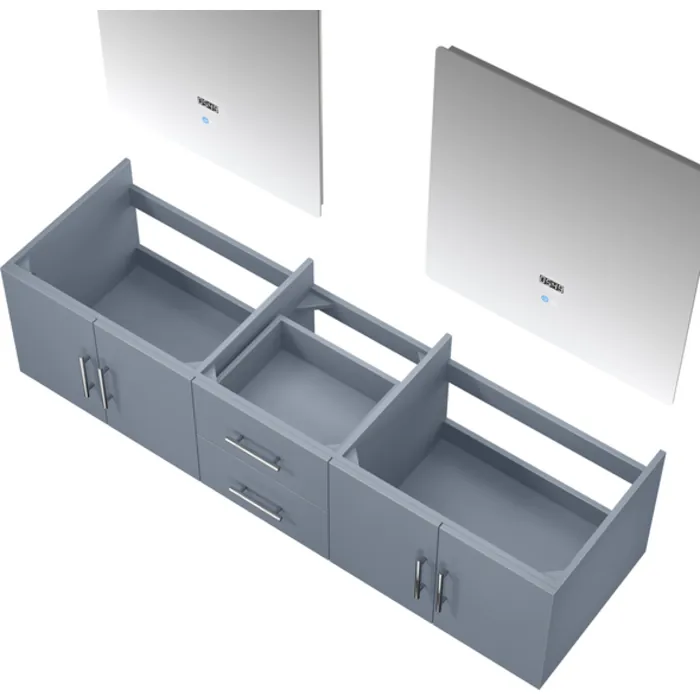 The wall-mounted Geneva vanity in dark grey from Lexora is a beautiful blending of postmodern style and sensible functionality. When mounted on the wall, the Geneva vanity leaves ample space beneath for additional storage—ideal for bathrooms with limited space. Available in other colors, you can easily match this vanity to any bathroom décor. And, with a with premium LED mirror(s), this piece is all you need to give your bathroom a total makeover.