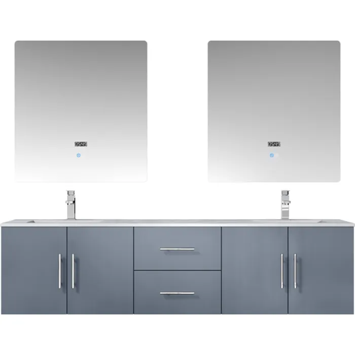 The wall-mounted Geneva vanity in dark grey from Lexora is a beautiful blending of postmodern style and sensible functionality. Its simple, box-like design is complemented by a marble countertop that lends hints of classical style. When mounted on the wall, the Geneva vanity leaves ample space beneath for additional storage—ideal for bathrooms with limited space. Also available in other colors, you can easily match this vanity to any bathroom décor. And, with two undermount sinks and a with premium LED mirror(s), this piece is all you need to give your bathroom a total makeover.